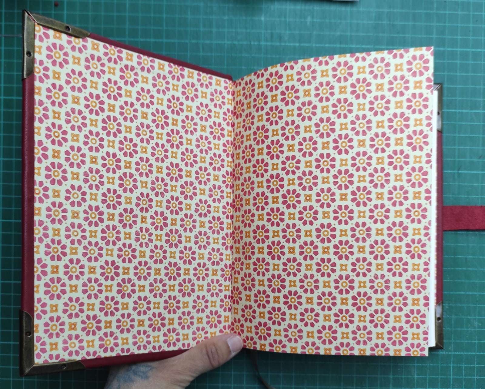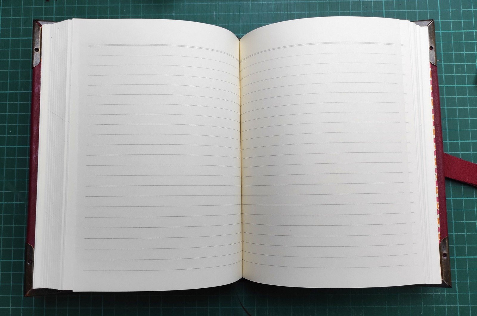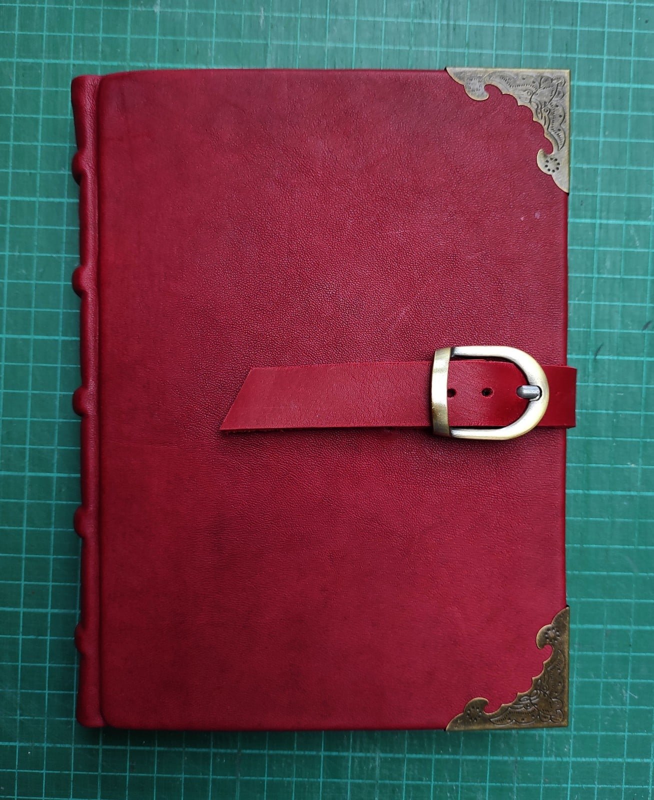 Nappa bőr borítású, gerincén bordázott, antikolt csattal záródó, sarkain antikolt sarokvédővel, marhabőr szíjjal. A5 méret. Alapárban 120 grammos papír, 280 oldal.