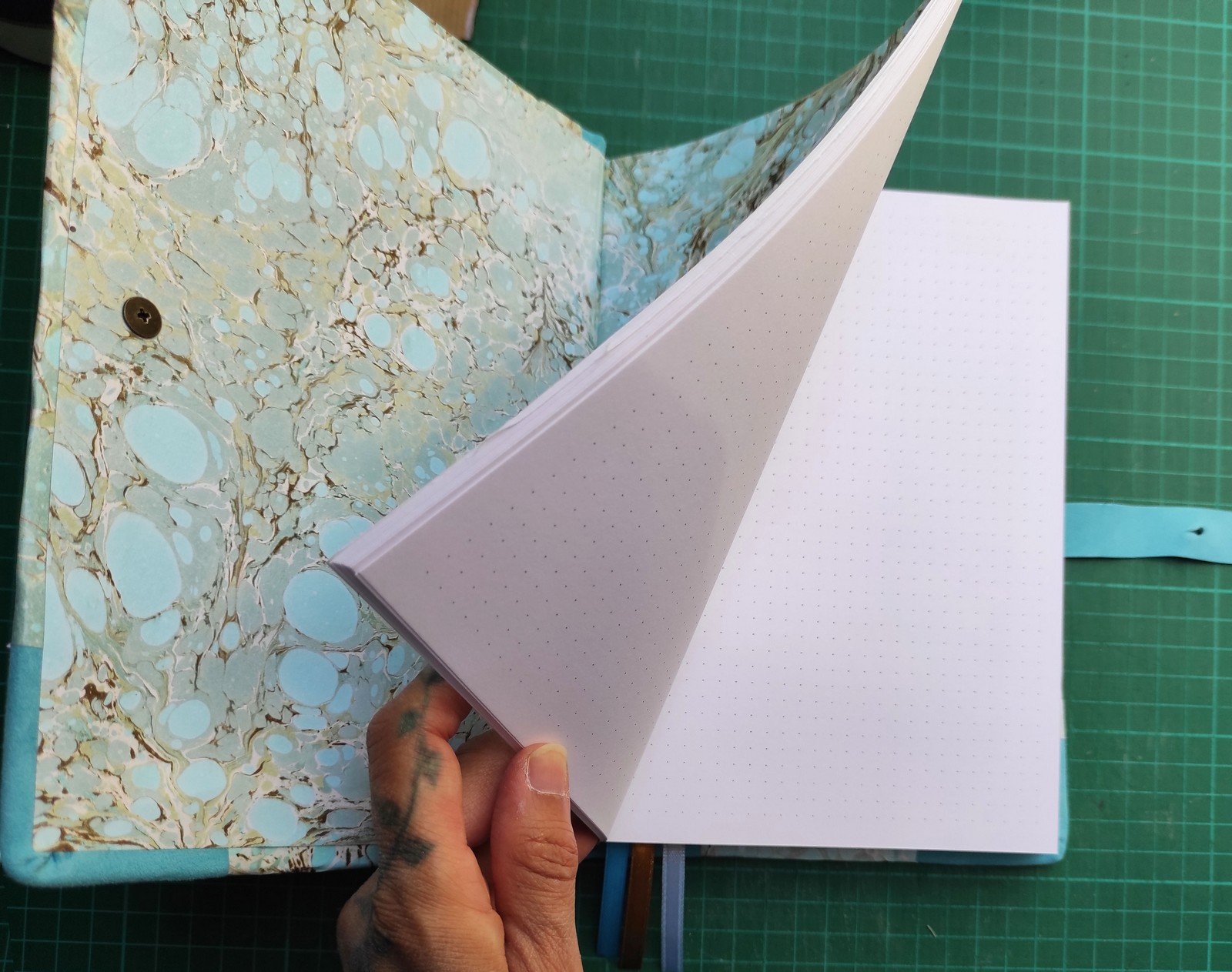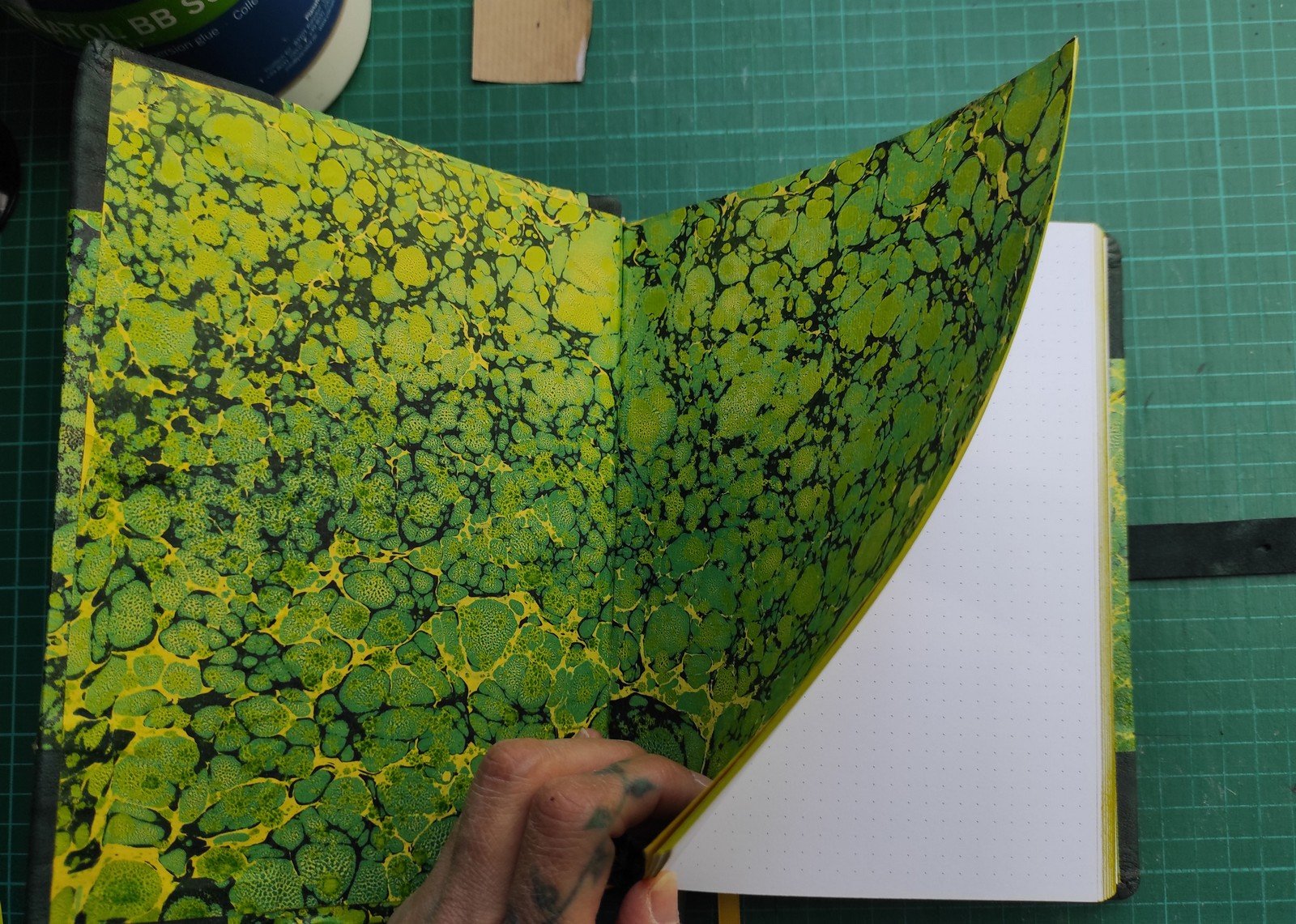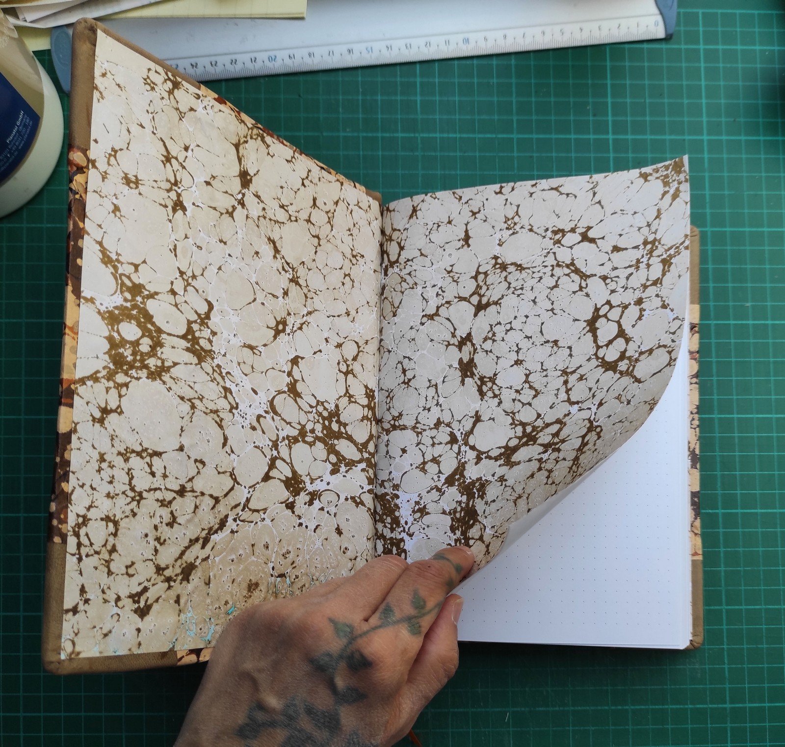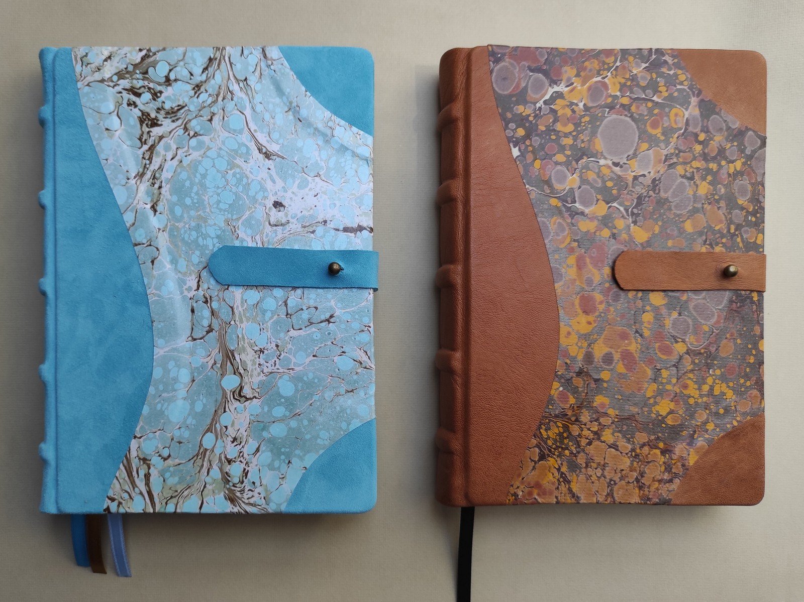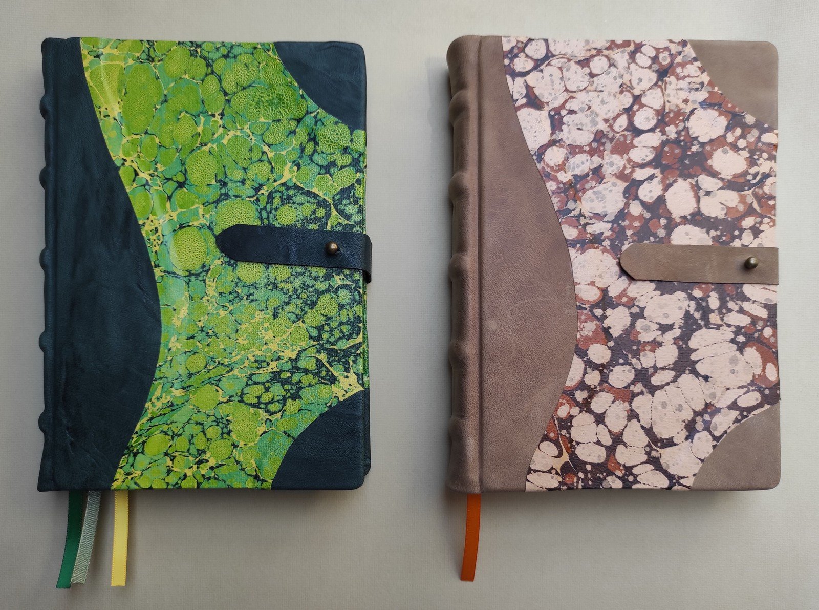 Hagyományos kézi festéssel, márványozott (ebru) technikával készült, félbőr kötésű naplók.